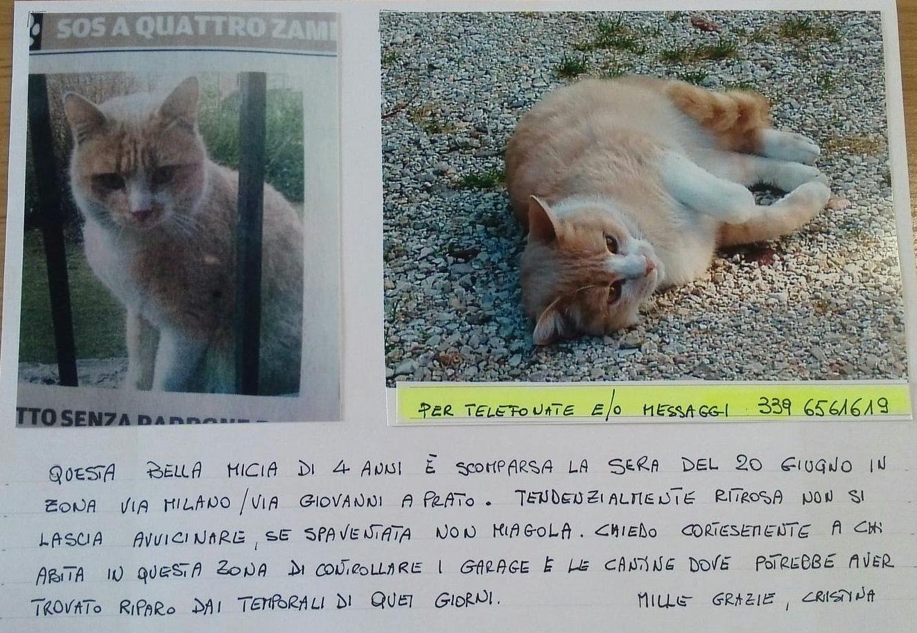 Smarrita il 20 giugno in via Milano via Giovanni a Prato. 339 6561619